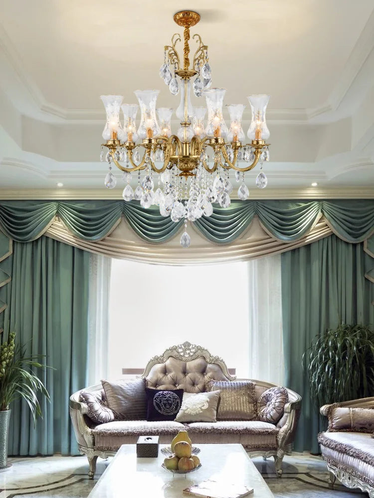 French-style brass crystal LED chandelier. Designed to bring a touch of luxury and sophistication, this exquisite pendant light features high-quality brass construction and dazzling crystal accents, creating a stunning focal point for any space. The energy-efficient LED lighting provides a warm, radiant glow, making it perfect for living rooms, dining areas, grand foyers, and upscale interiors.