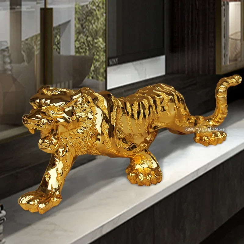 Gilded Elegance: Golden Lucky Tiger Sculpture - A Majestic Resin Craft for Modern Home & Office Decor!