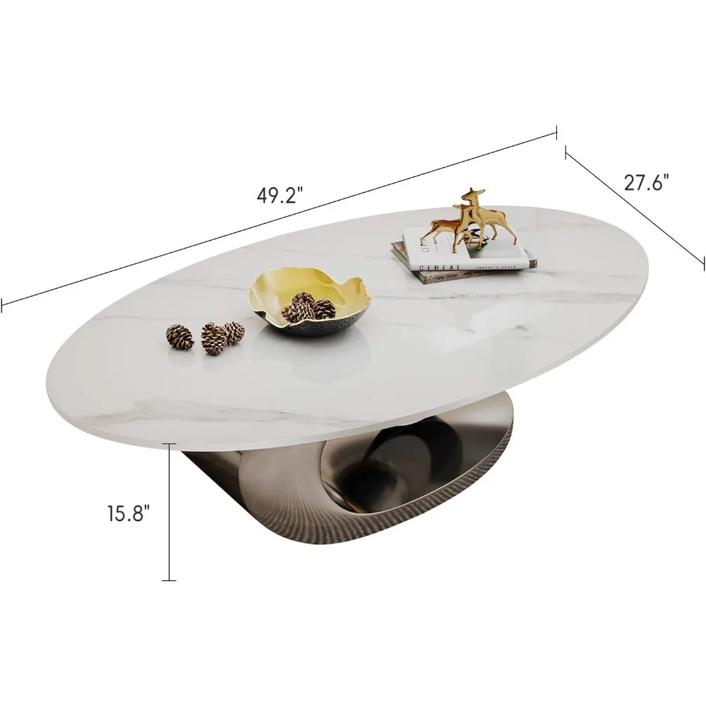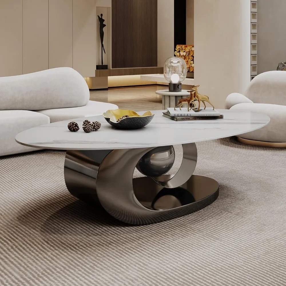 Modern Oval Stone Coffee Table Elegant Gray Metal Base Centerpiece for Luxury Living Rooms