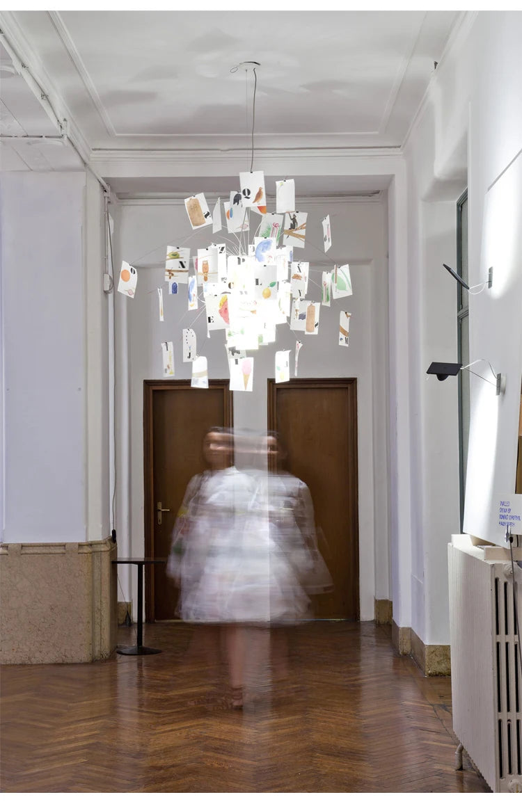 this unique chandelier brings together artistic charm and modern functionality. Featuring a sleek chrome frame adorned with customizable paper notes, it allows you to express your creativity and personal style in any space. Perfect for living rooms, bedrooms, or dining areas, this chandelier casts a warm, diffused glow that instantly transforms any room into a sophisticated haven. Add a touch of avant-garde Italian design to your home and redefine your space with this captivating lighting piece