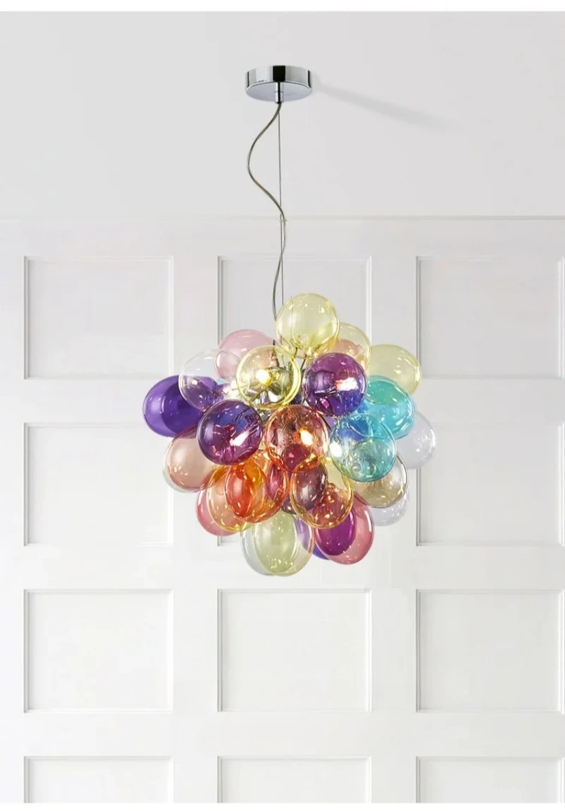 Add a touch of elegance and playfulness to your home with the Stunning Colored Glass Pendant Light! Featuring vibrant glass ball bubbles in a Nordic-inspired design, this modern chandelier creates a warm and inviting ambiance. Perfect for living rooms, bedrooms, kids' rooms, and stylish interiors, its artistic balloon-like design brings a unique charm to any space. Crafted from high-quality glass and metal, this eye-catching pendant light is both durable and energy-efficient. Whether you want a whimsical touch for a nursery or a chic statement piece for your living space, this colorful bubble chandelier is the perfect choice